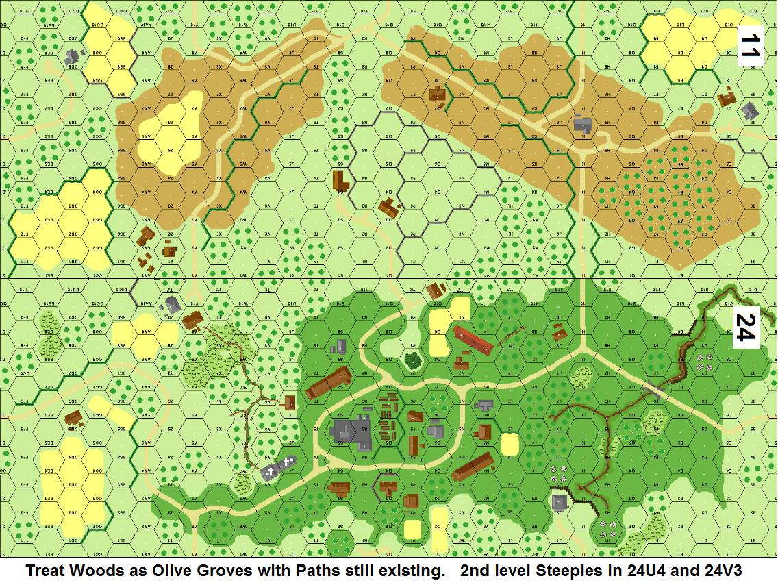 | Misc Rules: | Woods: Olive Groves (B14.8), Paths still existing. A: Tank crews inexperienced w D: FB (B23.9) |