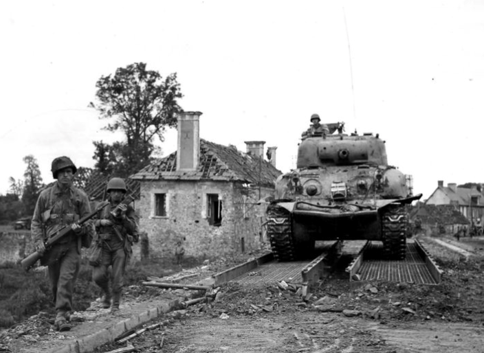 The US crossing of the Vire River had gone better than anticipated. The 117th Infantry Regiment had three companies across under the cover of a heavy mist, and they fanned out to secure a bridgehead. After crossing the Vire River and clearing the bank, Company G pivoted sharply to the left and drove south against Pont de St. Fromond. Heavily equipped with rifle grenades and bazookas, Company G attacked the village. The defenders, remnants of Kampfgruppe Heintz fought with tooth and nail.Attacker: American (Company G, 117th Infantry Regiment)