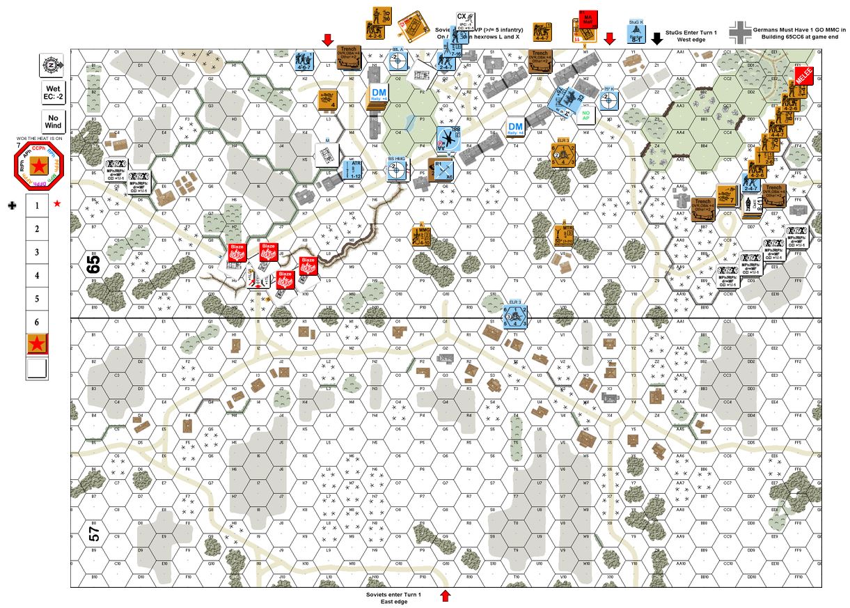The Germans mistakenly set up only on board 57 so the defense was not as robust as it could have been. The German 88L was extremely successful in wrecking most of the Russian armor. The HMG had little effect. Wire slowed the Russian advance on the right holding back attempts to take the Victory building. On the final turns, 3 Russian units went Berserk allowing the attackers to make it to the building doorstep, but the scenario was lopsided enough to still give the Germans the win.