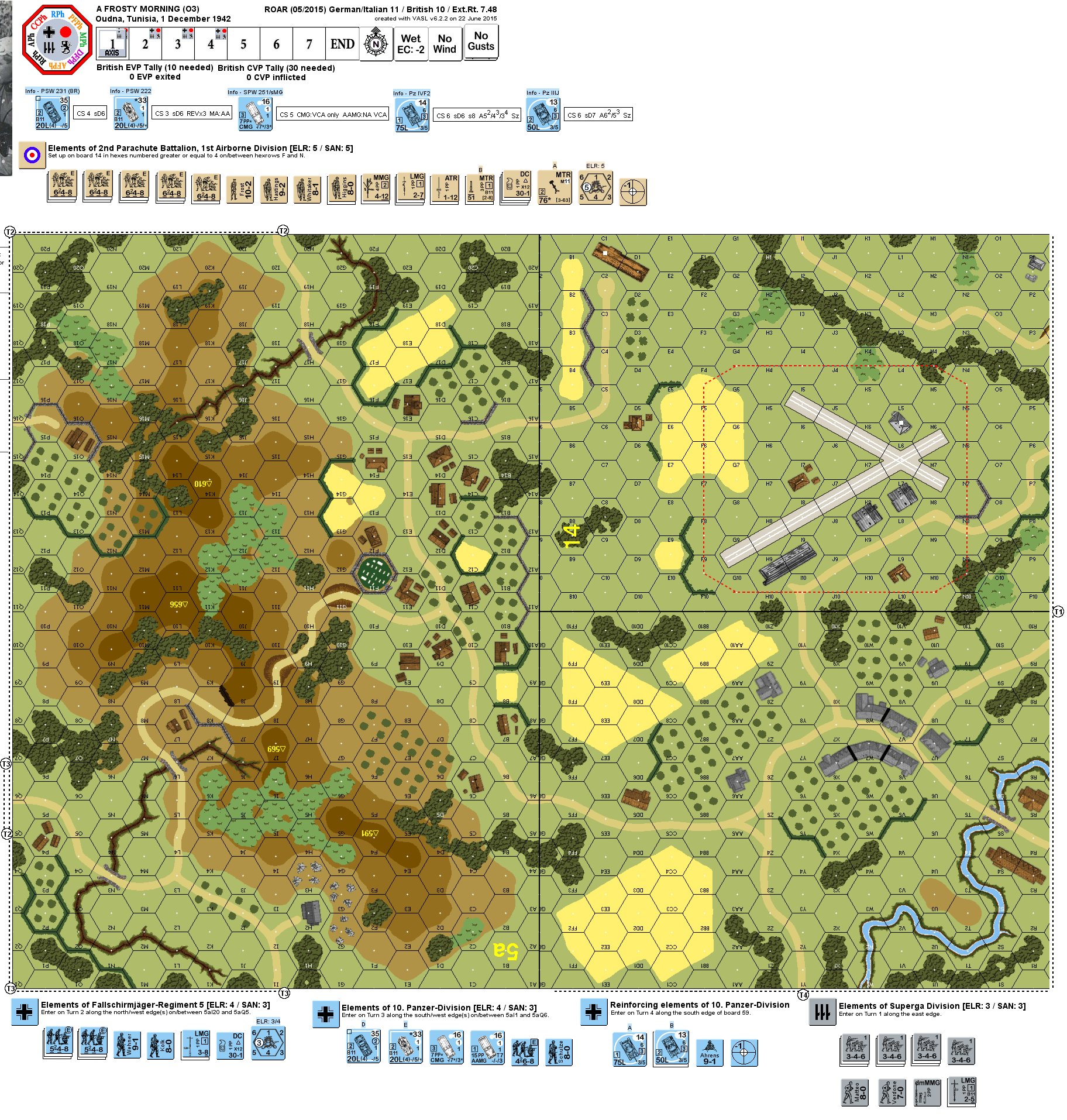 On the morning of 29 November, the 530 strong battalion boarded 44 transport aircraft and took off, bound for Oudna. Because there had been insufficient time to conduct an aerial reconnaissance of the airfield, Lieutenant Colonel Frost was forced to choose a landing zone for the battalion from his position in the lead aircraft, fortunately locating a clear, open space near the airfield. By 11:00 on 30 November the battalion had reached a position that allowed it to overlook the Oudna airfield, and at 14:30 it began to advance and reached the airfield, only to find that it, too, had been abandoned. The battalion was then counter attacked by a number of German tanks supported by fighters and Stuka divebombers. The Germans were repelled, but at dusk Frost pulled the battalion back westwards to a more defensible position, hoping to await the arrival of advance units from British First Army. The battalion managed to withdraw to higher ground, but suffered a number of casualties from the German armor as it did so. Now positioned on the high ground, which consisted of a ridge crowned by two small hills, the paratroopers were attacked by tanks and infantry supported by heavy mortar fire.Attacker: German / Italian (Italian Superga Division, Fallschirmjaeger-Regiment 5 and 10th Panzer Division)