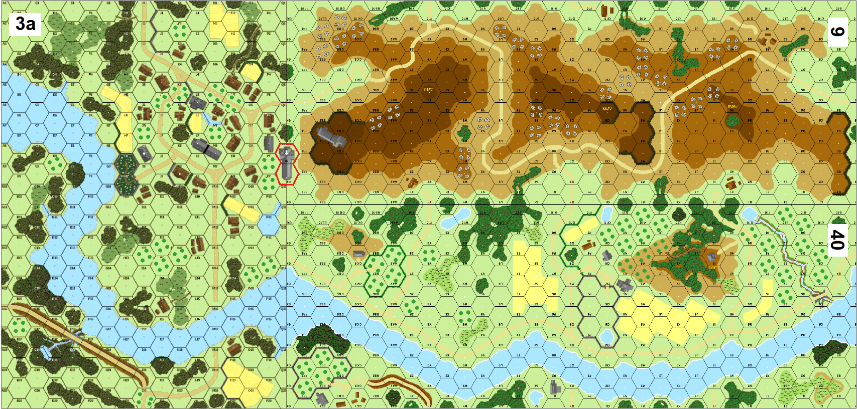 Difficult to comment on play-balance here because the dice were clearly on my side, particularly for the 81mm mortar (which I set up south of the river) which scored TWO critical hits, knocking out the Russian ART gun and one MMG. The Russians decided, probably wisely, not to defend the Board 3a village at all. Instead they placed delaying forces near the two southern-most victory buildings, with the bulk of their forces defending the hilltops, In response, my boats came across on the extreme right (east), and got ashore with virtually no losses thanks to a combination of smoke and LV hindrance.