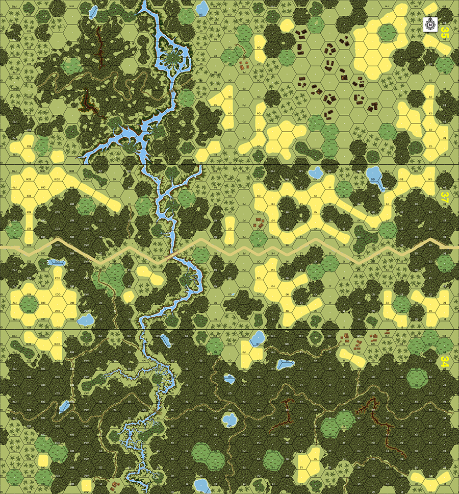 Dan and I found this scenario to be a wild and fun one. The challenging VC for the Americans are represented by the near 2:1 Japanese-American win-loss ration; however, I really cannot see how the Americans have not won more games. The Japanese have the benefit of high morale, a good selection of SWs (including two HMGs), quite a few HIP units, tank-hunter heroes (generally only really useful to draw fire), and fortifications. The Americans have over-the-top high firepower (multiple, 20-30 firepower attacks each player turn are not out of the question), two FTs, and some decent tanks (although those tanks don't have any real smoke capability - I'm not counting the SM5s...). In our scenario, I searched in, around, and through the village to ensure there were no hidden Japanese nearby that could run and capture multiple huts in the end-game. My Turn 2 reinforcements methodically moved down the road, then off to the side to avoid the space of open ground in the middle of Board 37. Dan had positioned a couple squads on Board 35 past the village and near the stream. He placed one of his pillboxes there as well. My Americans were able to reduce these positions by Turn 4/5, and this allowed all those American forces to add their weight against the attack on the bridge area. My Turn 2 troops were slowed down by several Japanese squads as they moved across the kunai in the center of Board 37, and were surprised by a HIP unit in a place I did not expect and by one of his HMGs and a leader in another HIP pillbox. His HIP unit KIA'd one of my 7-4-7s carrying a FT and the 7-0 leader with them (ouch! why would I think its okay to lead with those guys...). In a stroke of luck for me, on a simple 1MC vs. the crew+HMG and leader in the pillbox, Dan rolled a '12' for the crew and that was the end of that. Although the leader took possession of the HMG, he immediately malf'd it. As I neared the bridge area, Dan's banzai reinforcements arrived (on the second turn possible). I thought I had positioned my Americans and their supporting four tanks on Board 37 to annihilate them... During the next three turns, Dan's banzai troops got into my Americans (somehow surviving all my 12-1s, 20-1s, etc.). Turns out it's moderately hard to reduce a banzai'ing Japanese 4-4-7 stacked with a 10-1 leader.... However, in the resulting melees, Dan's Japanese got ambushed a couple times and failed to kill the Americans in a couple other hexes. He lost several squads in melee the first banzai turn and several more the second turn. At the end of Turn 7, 15 of the 18 banzai squads were dead and one other was broken as two HS; this at the cost of two American tanks, and several American squads. I moved tanks into the stream and chanced Bog checks to cross it and into hexes adjacent to swamps vice attempting the no-small-chance bridge collapse (the wooden bridge collapses on a 7 or above...). Dan's last pillbox was placed in one of the bridge area VC hexes; it contained the 10-2 and the other HMG+crew). I was able to get a 20+5 vs it and caused an NMC. Again, Dan rolled a '12' for his crew (killing this one as well). At this point Dan conceded. I had four remaining tanks and over 20 EVP of infantry either across the stream and/or about to cross the stream, with three turns to go. He had one good order squad, his 10-2, and his AT gun, (and two remaining good order squads from the banzai force), but did not feel he would be able to hold. On a side note, my two OBA modules did a little bit (causing a total of two Japanese squads to stripe and one broken HS to die), but not much; one radio malf'd and X'd before I could even get one fire mission out of it (must have been the crystals). We both had fun with this one.