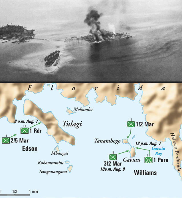 Following the costly repulse of Company B of the 2nd Marine Regiment on Tanambogo, the 3rd Battalion of the 2nd Marines was ordered to land on Gavutu at dawn, relieve the exhausted paratroopers, and capture Tanambogo by the end of the day. Ashore at 0700 that Saturday, the 3rd Battalion spent the morning methodically blasting the Japanese out of cave emplacements with TNT. At 1330, with Gavutu secured, they turned their attention to the island across the inlet. A two pronged attack was settled on. Company I, along with two tanks and supported by continuous air and naval bombardment, would make an amphibious assault on the same beach where the night attack had come to grief. Meanwhile, a platoon of K Company would rush across the causeway on foot to outflank the Japanese defenders on the hill.Attacker: American (USMC) (1st Platoon, Company K, 2nd Marine Regiment/Company I, 3rd Battalion, 2nd Marine Regiment and Company B, 2nd Marine Tank Battalion)