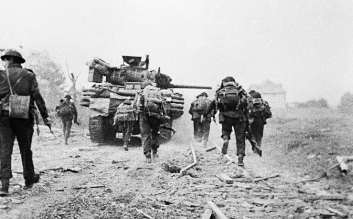 Operation Charnwood: At 1835-hrs, two battalion of the 7th Canadian Infantry Brigade had been moved forward to positions near the Authie-Gruchy area. The 1st Battalion Canadian Scottish Regiment advanced on Cussy, the Regina Rifles Regiment on the Ardennes Abbey. Supported by heavy mortars and machine-guns of the Cameron of Ottawa and the tanks of the 1st Canadian Hussars, the Canadians attempted to pry the fanatical “Hitler Youth” from Cussy and the Abbey. Not until their own barrage lifted a few hundred yards from the village did the lead companies see their objective clearly. At that point a cry went up “Come on Scottish!” and the assault platoons surged forward.Attacker: Canadian (1st Canadian Scottish Regiment supported by First Canadian Hussars)
