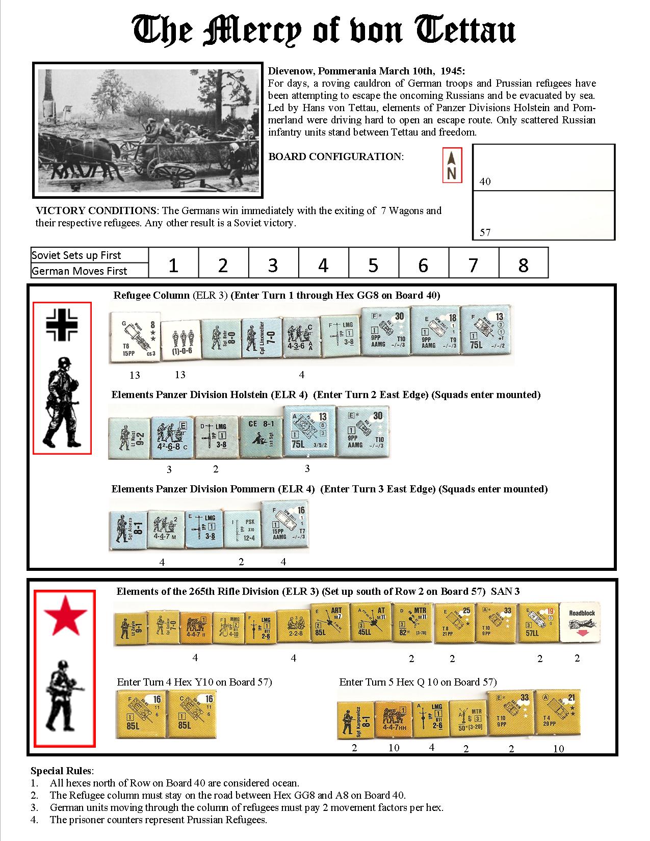 For days, a roving cauldron of German troops and Prussian refugees had been attempting to escape the oncoming Russians and be evacuated by sea. Led by Hans von Tettau, elements of Panzer Divisions Holstein and Pommern were driving hard to open an escape route. Only scattered Russian infantry units stood between Tettau and freedom.Attacker: German (Refugees, Pz Div Pommerania and Pz Div Holstien)