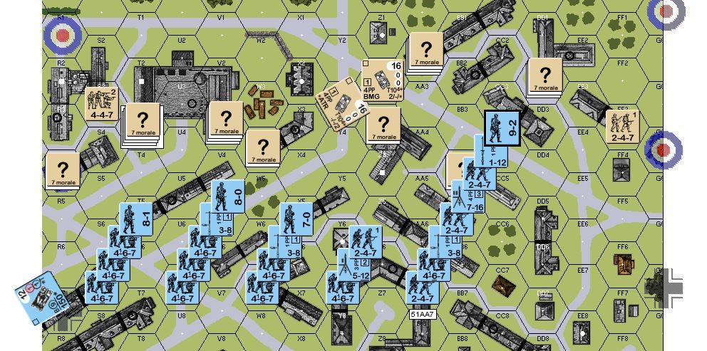 The defender setup seemed balanced left/right of the middle board road, so I decided to split them in half by sending 3 sq with the MMG/ATR and HMG in the middle to interdict the road and preventing the squads of the east side of the board joining the fight or at least making it costly.