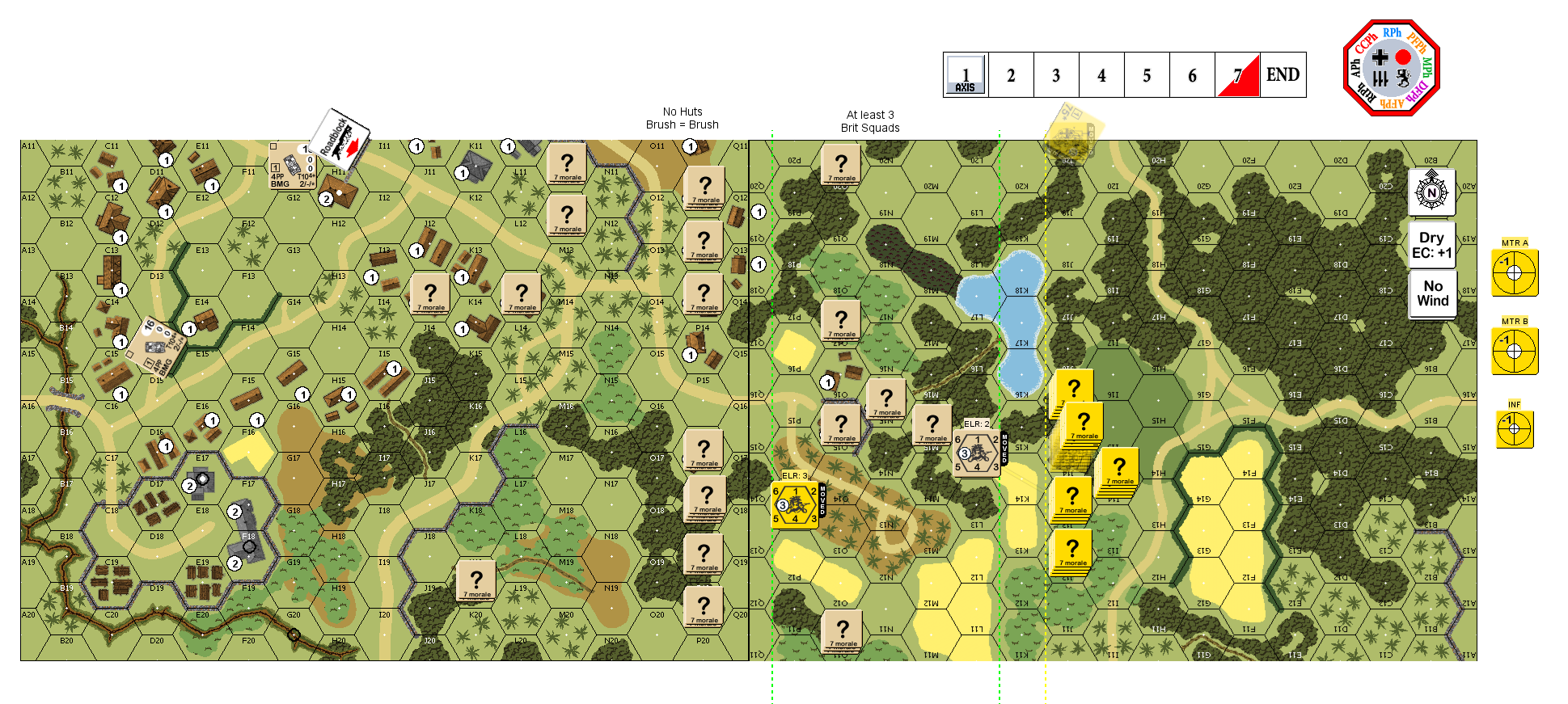 | Misc Rules: | PTO (Exc: Roads exist, no huts and Brush remains Brush) A: Stealthy |