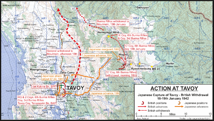 Men of the 3rd and 6th Burma Rifles were about to experience their baptism of fire. The Japanese were coming. They were coming not from the south, but from the east. British plans for the defence of Burma and Malaya were partly predicated on the ability of the Royal Air Force to maintain air superiority, and to interdict Japanese ship and troop movements. Indeed, until 1941 the RAF was primarily responsible for the defence of the British Far East, with the army relegated to guard duties at air and naval installations. In the Tenasserim district of Burma—a slender strip of land sandwiched between the Andaman Sea and Thailand—priority was given to the construction of aerodromes. The most important landing strips in the district were located at Moulmein, Tavoy, Mergui, and Victoria Point. Generally speaking, roads in the Tenasserim were bad. The only all-weather routes ran north south. Below Moulmein, only intermittent mountain tracks headed east toward Thailand. Even the road from Moulmein to the Burmese frontier post at Miyawadi was interrupted by an 80-kilometre stretch that was reportedly little better than a track. However, Major Oki, commander of the 3rd Battalion, 112th Infantry Regiment was a determined fellow. While the 2/143rd still held Victoria Point, Major Oki and his battalion departed Bangkok on 3 January. The target was the seaside town of Tavoy. The purpose of the tortuous trek was to cut the Tenasserim in two.Attacker: Japanese (3rd Battalion, 112th Infantry Regiment, 55th Infantry Division)