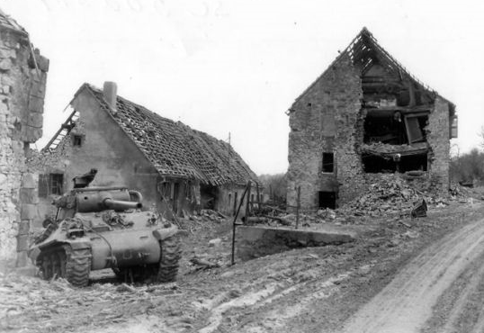 In the front line town of Rimling, a M36 tank destroyer stands in the protection of walls of bombed out building awaiting action.