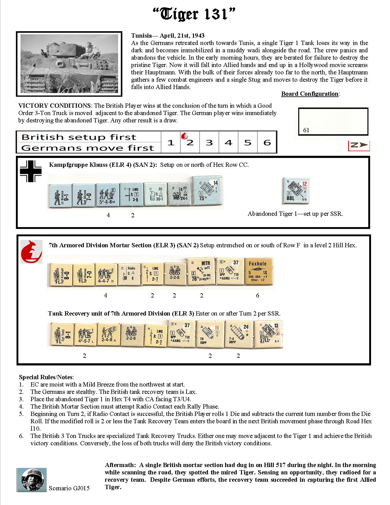 As the Germans retreated north towards Tunis, a single Tiger 1 tank lost its way in the dark and became immobilized in a muddy wadi alongside the road. The crew panicked and abandoned the vehicle. Not wanting the pristine Tiger to fall into Allied hands, their Hauptmann, with the bulk of their forces already too far to the north, gathered a few combat engineers and a single StuG and moved to destroy the Tiger before it was captured. A single British mortar section had dug in on Hill 517 during the night. In the morning while scanning the road, they spotted the mired Tiger. Sensing an opportunity, they radioed for a recovery team. The race was on…Attacker: German (Kampfgruppe Klauss)