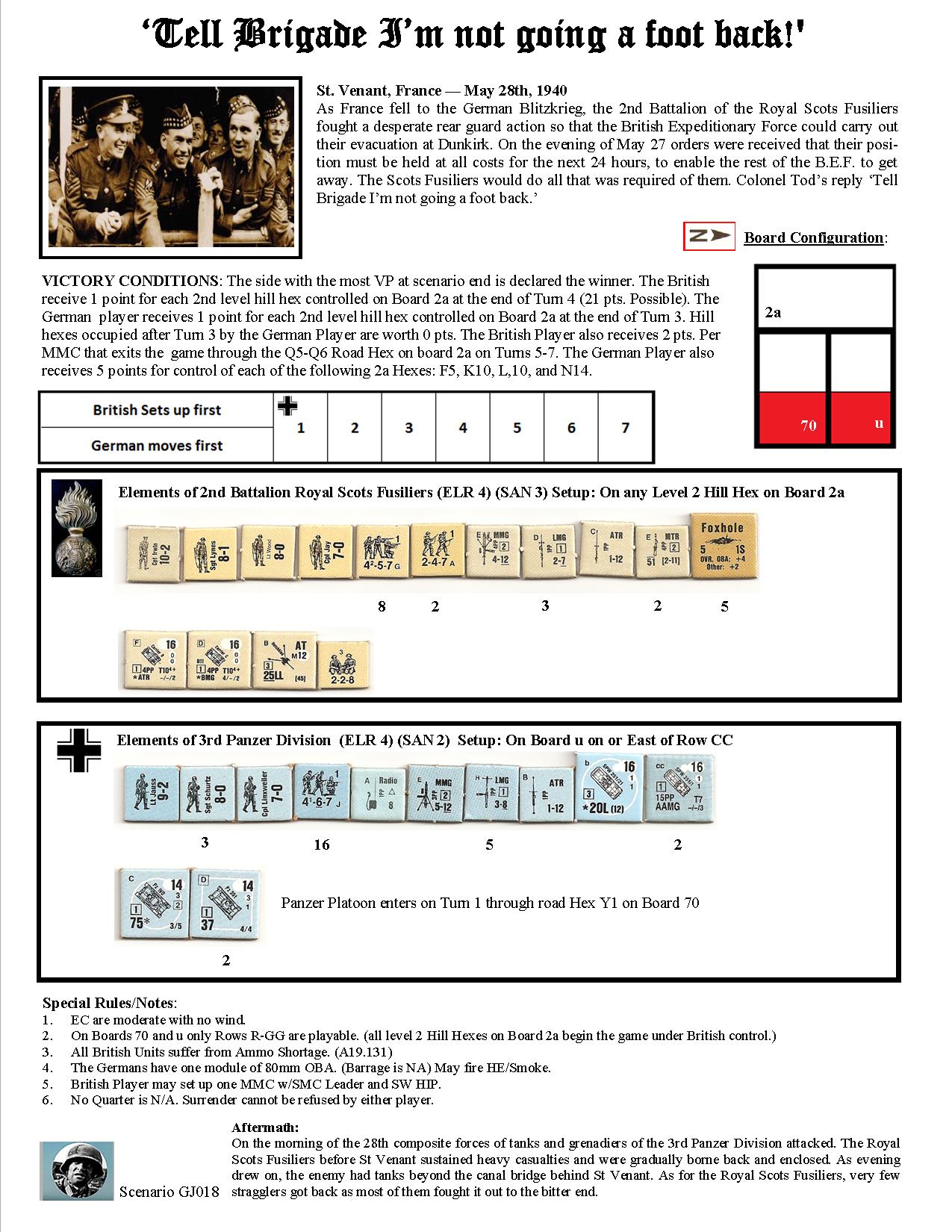 As France fell to the German blitzkrieg, the 2nd Battalion of the Royal Scots Fusiliers fought a desperate rear guard action so that the British Expeditionary Force could carry out their evacuation at Dunkirk. On the evening of 27 May orders were received that their position must be held at all costs for the next 24 hours to enable the rest of the B.E.F. to get away. The Scots Fusiliers would do all that was required of them. Colonel Tod’s reply: “Tell Brigade I’m not going a foot back.” On the morning of the 28th, composite forces of tanks and grenadiers of the 3rd Panzer Division attacked.Attacker: German (3rd Panzer Division)