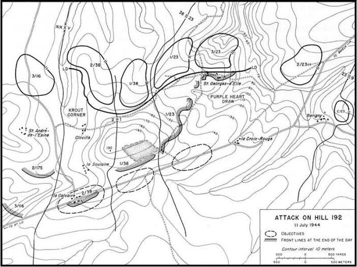 The objective of Cmopany A, 23rd Infantry Battalion was to reach the St-Lo-Bayeux highway by the end of the day. The attack began with 1st Platoon attempting to cross a gully running 750 yards east to west along the battalion's front. 1st Platoon's tank support was stopped by the gully, but the armor provided fire support from behind this obstacle. The Germans held their fire until 1st Platoon entered the gully, at which point a murderous pre-registered artillery barrage combined with automatic weapons' fire resulted in heavy American casualties, hence the name "Purple Heart Draw". With support from two tanks from Company C of the 741st Tank Battalion, 2nd and 3rd Platoons of Company A attempted to flank the draw from the west.Attacker: American (A Company, 1st Battalion, 23rd Regiment, 2nd Division and C Company, 741 Tank Battalion)