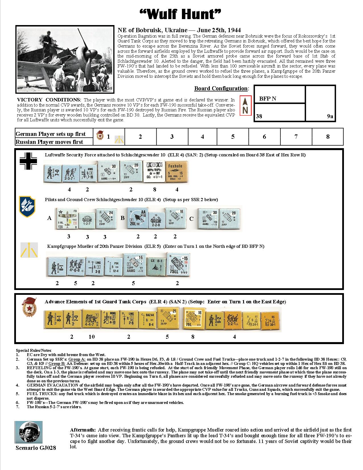 Operation Bagration was in full swing. The German defenses near Bobruisk were the focus of Rokossovsky’s 1st Guard Tank Corps as they moved to trap the retreating Germans in Bobruisk, which offered the best hope for the Germans to escape across the Berenzina River. As the Soviet forces surged forward, they would often come across the forward airfields employed by the Luftwaffe to provide forward air support. Such would be the case on the mid-morning of the 25th as a Soviet armored probe came across the forward base of 1st Stab of Schlachtgeswader 10. Alerted to the danger, the field had been hastily evacuated. All that remained were three FW-190’s that had landed to be refueled. With less than 100 serviceable aircraft in the sector, every plane was valuable. Therefore, as the ground crews worked to refuel the three planes, a Kampfgruppe of the 20th Panzer Division moved to intercept the Soviets and hold them back long enough for the planes to escape.Attacker: Russian (Advance elements of 1st Guards Tank Corps)