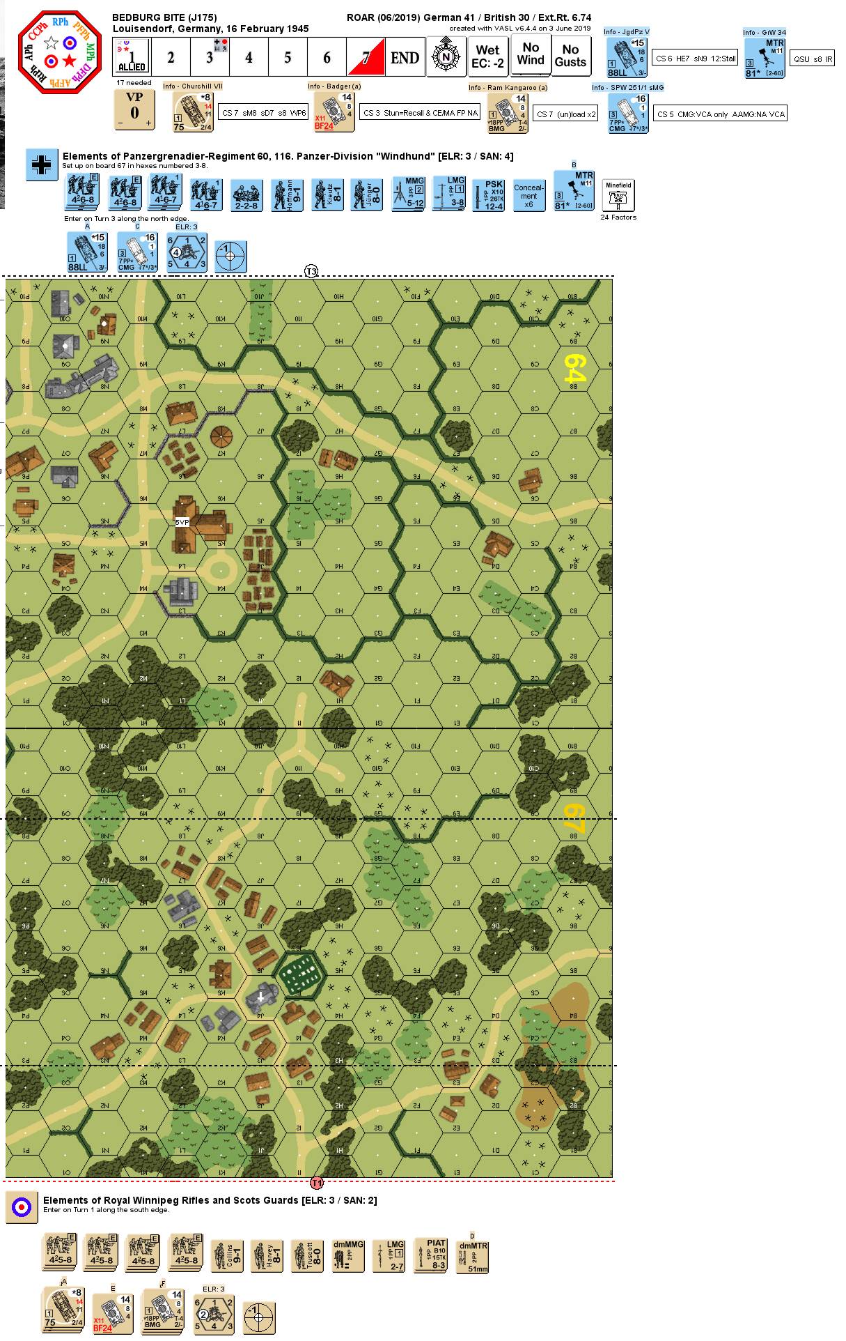 To kick of the attack known as Operation VERITABLE, the Royal Winnipeg Rifles, supported by the 3rd Armoured Battalion of the Scots Guards, was ordered to take the hilly ground around Louisendorf, south of Moyland. This would protect the right flank of the main attack by the Regina Rifle Regiment, which was to force its way north and east, towards the Rhine, and sever the Goch-Kolcar road, thus splitting Panzer-Division 116 into two parts that would no longer be able to support one another. The Winnipeg Rifles, supported by Churchills, left their assembly area near Bedburg in Kangaroo carriers and headed across the dreary fields towards Louisendorf.Attacker: Canadian (Royal Winnipeg Rifles and Scots Guards)