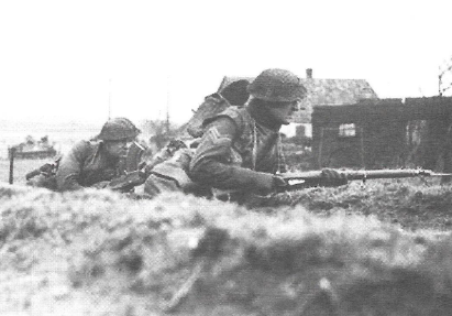 In front of A and C Companies of the Royal Hamilton Light Infantry, B Company, under the command of Major Duncan Kennedy, was attacking the Schwanenhof farmstead, located a few hundred yards past the Goch-Kalkar road. The Kangaoos dropped the men short of their objective, from where they had to continue their assault over open ground without the benefit of armor support. Lt. Williamson’s platoon provided covering fire and smoke from their 2-inch mortar.Attacker: Canadian (B Company, Royal Hamiliton Light Infantry)