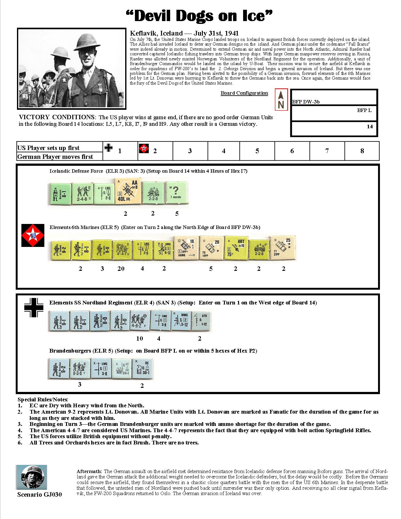On July 7th, the United States Marine Corps landed troops on Iceland to augment British forces currently deployed on the island. The Allies had invaded Iceland to deter any German designs on the island. And German plans under the codename “Fall Ikarus” were indeed already in motion. Determined to extend German air and naval power into the North Atlantic, Admiral Raeder had converted captured Icelandic fishing trawlers into German troop ships. With large German manpower reserves serving in Russia, Raeder was allotted newly minted Norwegian Volunteers of the Nordland Regiment for the operation. Additionally, a unit of Brandenburger Commandos would be landed on the island by U-Boat. Their mission was to secure the airfield at Keflavik in order for squadrons of FW-200’s to land the 2. Gebirgs Division and begin a general invasion of Iceland. But there was one problem for the German plan. Having been alerted to the possibility of a German invasion, forward elements of the 6th Marines led by 1st Lt. Donovan were hurrying to Keflavik to throw the Germans back into the sea. Once again, the Germans would face the fury of the Devil Dogs of the United States Marines.Attacker: German (SS) (SS Nordland Regiment and Brandenburgers)