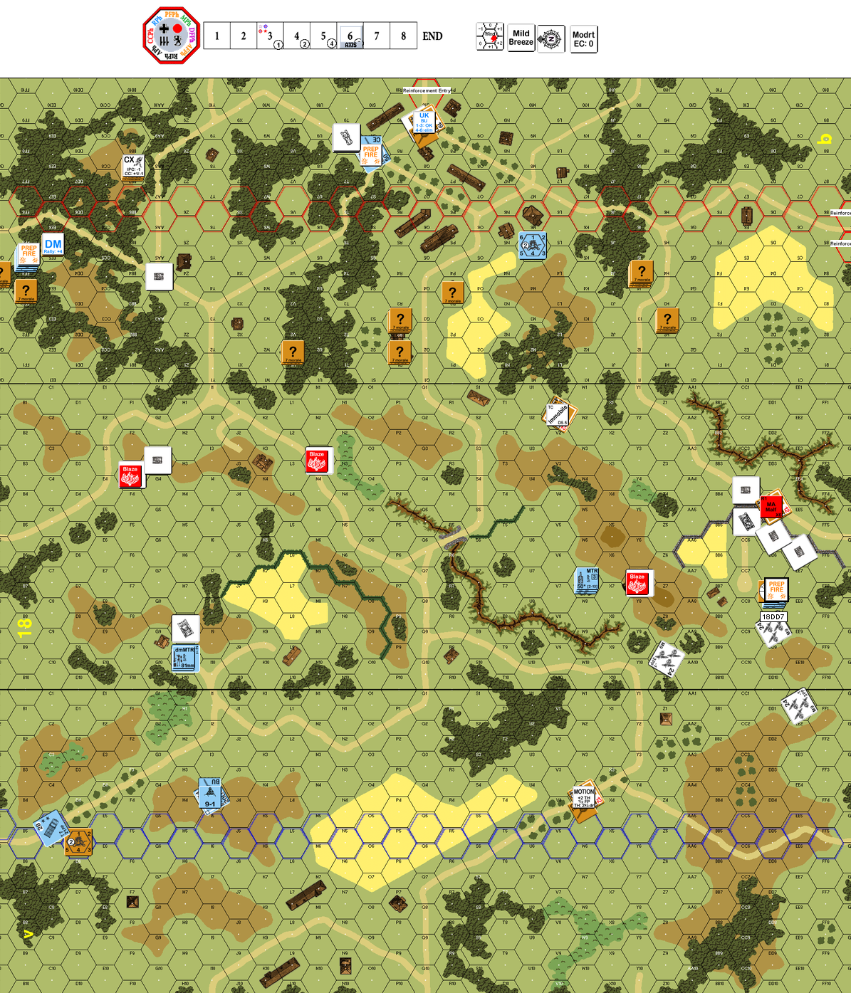End of a playtest match; German wins early. Tough fighting by the stone wall in the south.