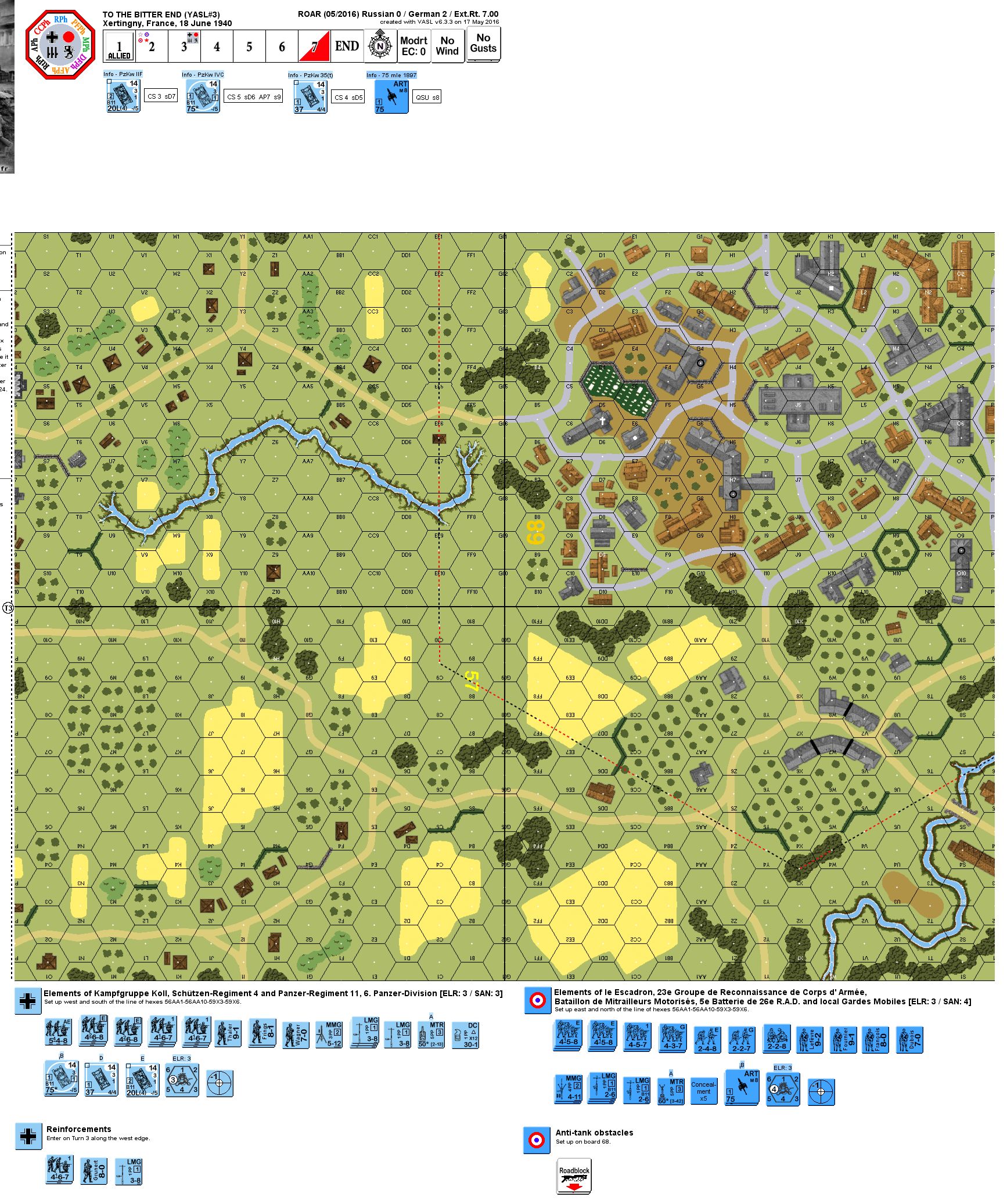 Defender: French (Elements of 1e Escadron, 23e Groupe de Reconnaissance de Corps d’Armée, 55e Bataillon de Mitrailleurs Motorisés, 5e Batterie de 26e R.A.D. and local Gardes Mobiles)