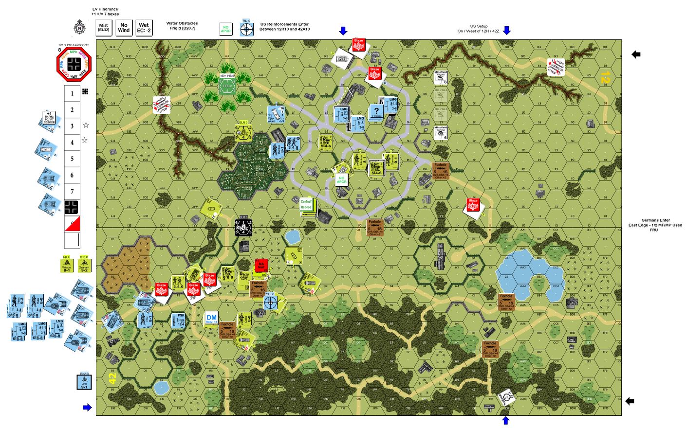 | Misc Rules: | Mist LV, Stone Buildings, Water obstacles are Frigid, Bldg hex 12R7 is Marketplace |