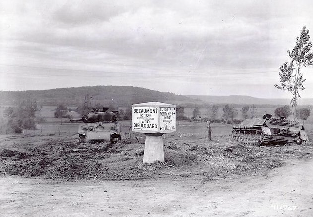 Knocked out Sherman and Jagdpanzer IV at a crossroads near Le Pont-de-Mons.