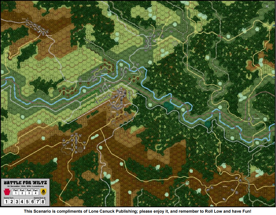 Campaign Scenario and VASL map available for free on Lone Canuck website...As the American 110th Infantry Regiment gave way along the Our River, the Germans were under orders to bypass Wiltz, in order to rush Bastogne and capture it as quickly as possible. However, one regiment of the 5.Fallschirmjägerdivision ignored the order and attacked Wiltz. Soon other German units were sucked into the vortex of battle. The rest of 5.Fallschirmjägerdivision and the following 26.Volksgrenadierdivision had to be committed to deal with Major-General Norman Cota’s stubborn Keystone troops of the 28th Infantry Division; who reinforced by Lieutenant-Colonel Kjeldseth’s 44th Engineer Combat Battalion and an ad hoc force of clerks, cooks, & orderlies of the 28th’s Headquarters prepared them to meet the advancing Germans. Under command of the 110th Infantry Regiment’s Executive Officer, Lieutenant-Colonel Daniel Strickler, the Americans held the German divisions at Wiltz for 24 hours, before they were forced to withdraw towards Bastogne. As the Americans withdrew, they made life difficult for the pursuing Germans. In the end the battle had cost the Germans nearly two days, urgently needed to reach the Meuse before American reinforcements arrived.Attacker: German (Elements of the II/78.Volksgrenadierregiment, 26.Volksgrenadierdivision and the II/14.Fallschirmjägerregiment, 5.Fallschirmjägerdivision and Fallschirmjägerkompanie 4)