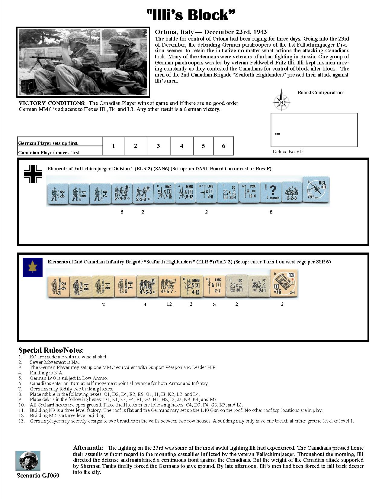 The battle for control of Ortona had been raging for three days. Going into the 23rd of December, the defending German paratroopers of the 1st Fallschirmjaeger Division seemed to retain the initiative no matter what actions the attacking Canadians took. Many of the Germans were veterans of urban fighting in Russia. One group of German paratroopers was led by veteran Feldwebel Fritz Illi. Illi kept his men moving constantly as they contested the Canadians for control of block after block. The men of the 2nd Canadian Brigade “Seaforth Highlanders” pressed their attack against Illi’s men.Attacker: Canadian (2nd Canadian Infantry Brigade "Seaforth Highlanders")