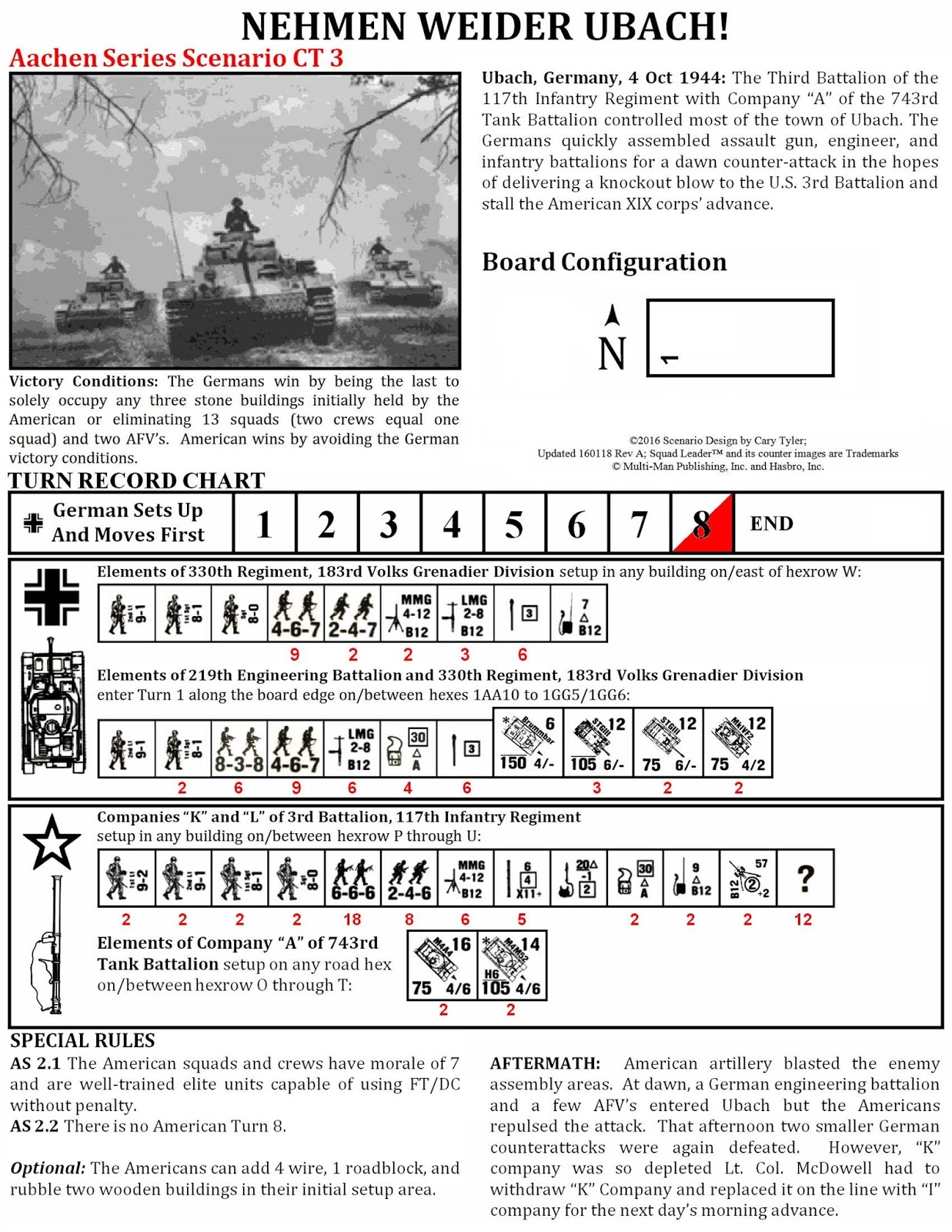 The 3rd Battalion of the 117th Infantry Regiment with armor support from Company “A”, 743rd Tank Battalion controlled most of the town of Ubach. The Germans quickly assembled assault gun, engineer, and infantry battalions for a dawn counter-attack in the hopes of delivering a knockout blow to the US and stall XIX Corp’s advance.Attacker: German (Elements of the 330th Regiment, 183rd Volksgrenadier Division and the 219th Engineering Battalion)