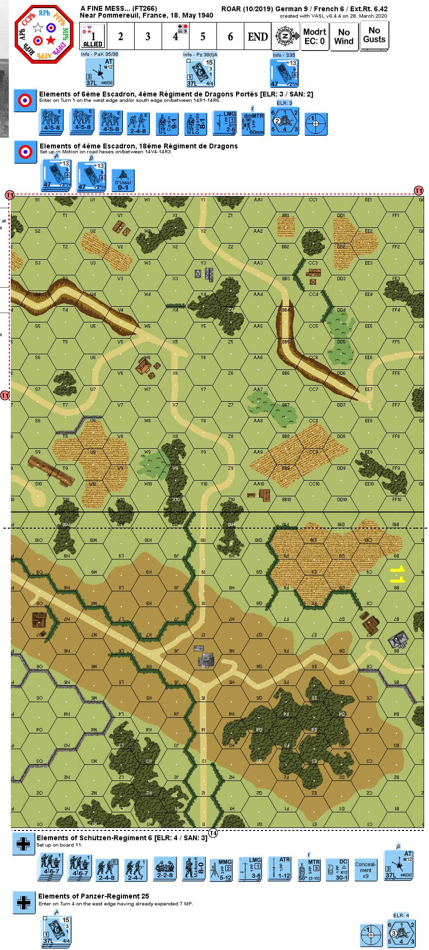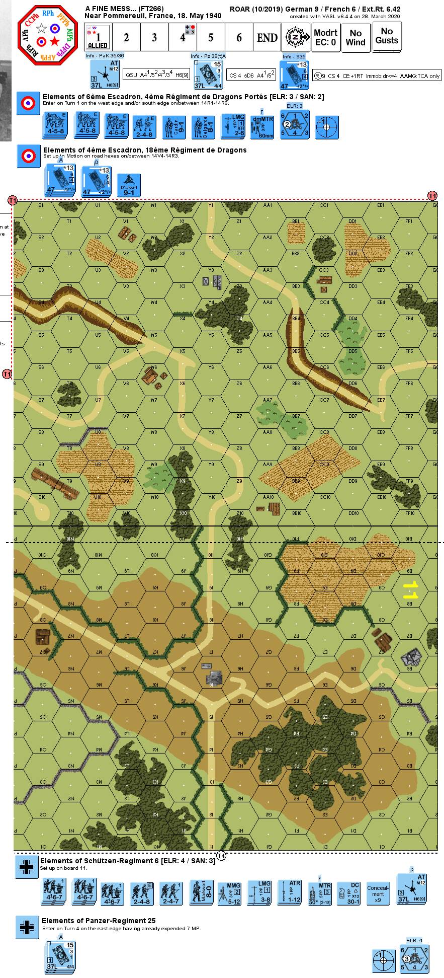 On 15th May, 1940, the 1ère Division Légère Mécanique, then deployed in the Netherlands, with little success, received the order to rush to the Sambre to stop the panzers advance from the Meuse. General Picard, commanding the 1ère DLM, arrived to find a “fine mess”. His leading elements obtained contact early in the morning of 17th, however the Somua S35, his strongest tanks, were unable to get into action providing little results by the end of the day. However, Picard planned a large counterattack for the day after, mustering both task forces of his division, each with a tank regiment. The 18ème Dragons under Colonel de Beauchesnes initiated a reconnaissance toward the Sambre with part of Capitaine d’Ussel’s squadron and some motorcyclists. The captain received the order “not to rush in, but to reconnoitre” and to bring his tanks back for the counterattack... Formerly released as VV75 "Un Beau Petrin..."Attacker: French (6ème Escadron, 4ème Régiment de Dragons Portés and 4ème Escadron, 18ème Régiment de Dragons)