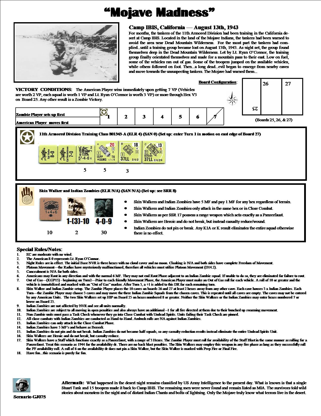 For months, the tankers of the 11th Armored Division had been training in the California desert at Camp IBIS. Located in the land of the Mojave Indians, the tankers had been warned to avoid the area near Dead Mountain Wilderness. For the most part the tankers had complied...until a training group became lost on August 13th, 1943. As night set, the group found themselves deep in the Dead Mountain Wilderness. Let by Lt. Ryan O’Connor, the training group finally orientated themselves and made for a mountain pass to their east. Low on fuel, some of the vehicles ran out of gas. Some of the troopers jumped on the available vehicles, while others followed on foot. Then...a long dead...evil began to emerge from nearby caves and move towards the unsuspecting tankers. The Mojave had warned them...Attacker: American (11th Armored Division Training Class 801343-A)