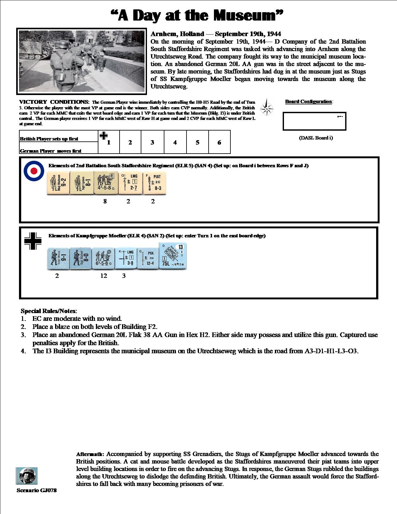 On the morning of September 19th, 1944, D Company of the 2nd Battalion South Staffordshire Regiment was tasked with advancing into Arnhem along the Utrechtseweg Road. The company fought its way to the municipal museum location. An abandoned German 20L AA gun was in the street adjacent to the museum. By late morning, the Staffordshires had dug in at the museum just as StuGs of SS Kampfgruppe Moeller began moving towards the museum along the Utrechtseweg.Attacker: German (SS) (Kampfgruppe Moeller)