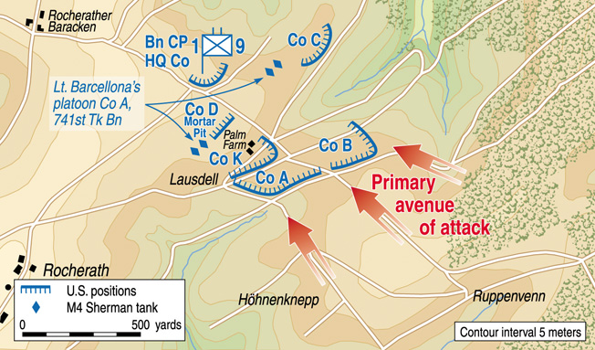 After an initial, pre-dawn foray to renew the attack, the main German effort to smash the resistance to their front came as the sun rose on 18 December. The morning light revealed a column of Panthers arrayed along the roads leading to Lausdell. The enemy tanks were ‘practically bumper-to-bumper, like boxcars’ and were soon the target of American artillery and Bazooka-teams. As Panthers began clearing out individual US foxhole positions, artillery began to fall on friend and foe; soon the cross roads was embroiled in a “mad-minute” of severe fighting. At 10:00 AM orders were received to withdraw, and by chance, four Shermans from Company A, 741st Tank Battalion, arrived just in time to be inserted into the fight and avoid a pell-mell retreat.Attacker: German (SS) (25th Panzergrenadier Regiment, 12th SS Panzer Division)