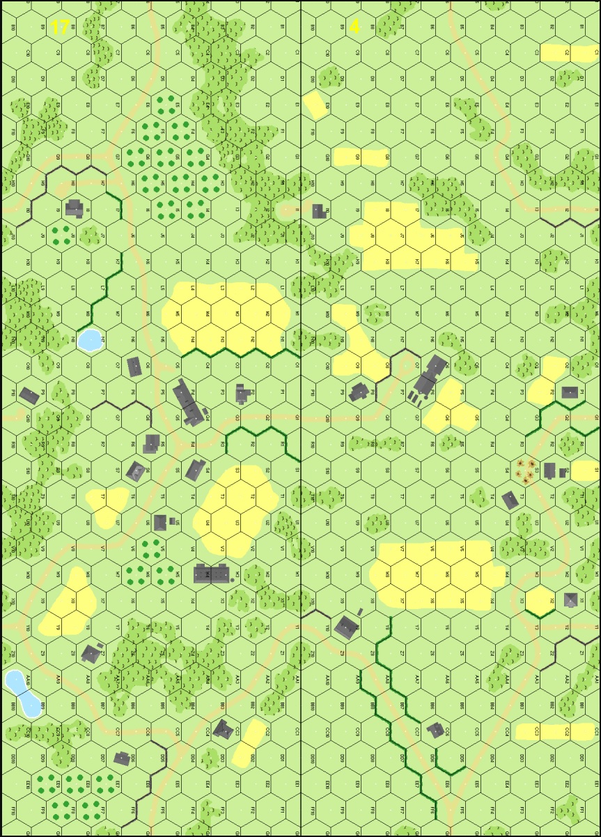 | Misc Rules: | Stone Bldgs, Treat Woods as Brush, Grain and Orchards in season, Multi-hex bldgs have Rooftops |