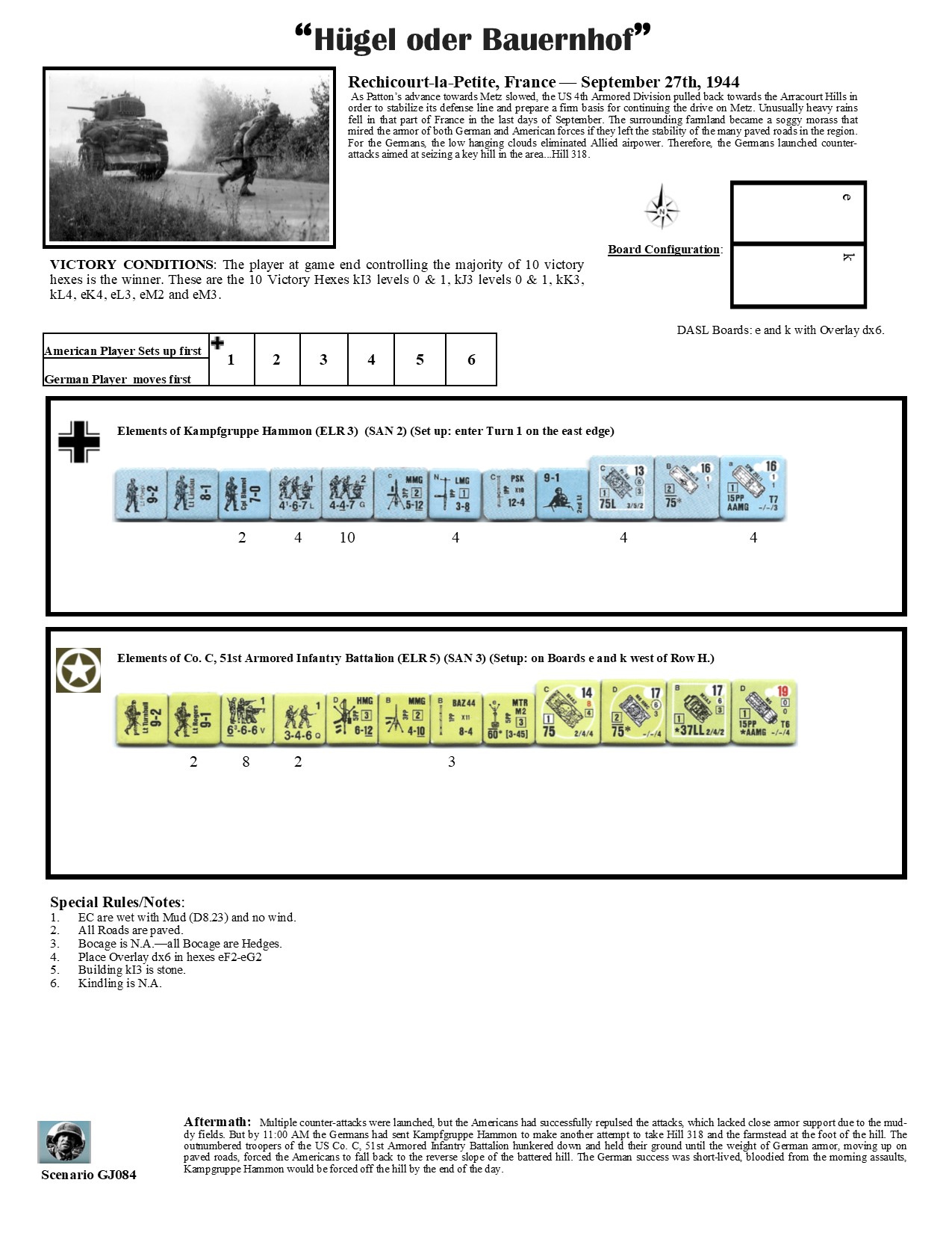 As Patton’s advance towards Metz slowed, the US 4th Armored Division pulled back towards the Arracourt Hills in order to stabilize its defense line and prepare a firm basis for continuing the drive on Metz. Unusually heavy rains fell in that part of France in the last days of September. The surrounding farmland became a soggy morass that mired the armor of both German and American forces if they left the stability of the many paved roads in the region. For the Germans, the low hanging clouds eliminated Allied airpower. Therefore, the Germans launched counterattacks aimed at seizing a key hill in the area...Hill 318.Attacker: German (Kampfgruppe Hammon)