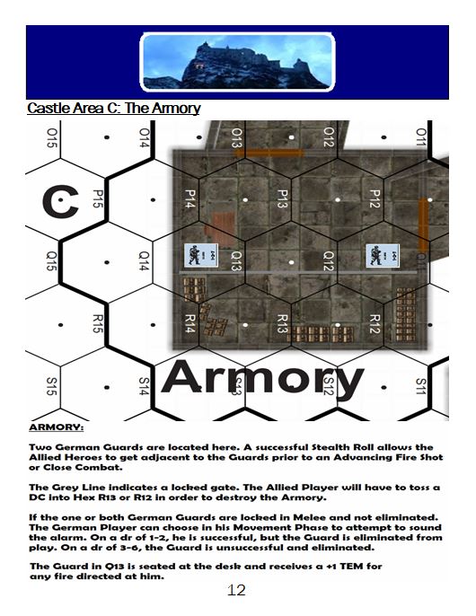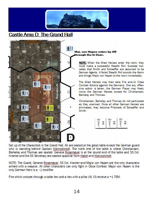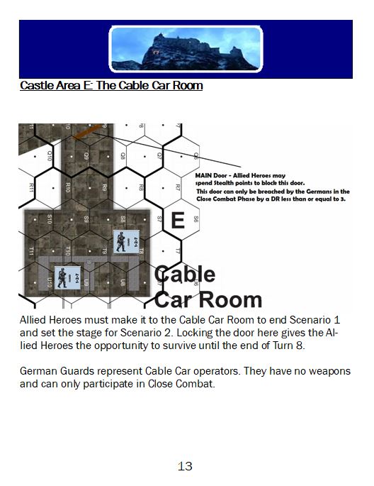Two American Communications Officer, Major Hallet and Captain Kleinschmidt have fallen into German hands. They have intimate knowledge of the planned radio transmissions scheduled for June, 1944, which will alert the French Resistance to begin actions in support of the Allied Invasion of Europe. The Germans intend to interrogate the two Americans and secure this information. Should Hallet and Kleinschmidt talk, the time-table for the Allied Invasion could be set back several months. Their rescue by a British/American strike-team is imperative. After parachuting into the snow-covered mountains around Werfen, Strike Team Broadsword entered the village of Werfen only to be betrayed by 3 double agents within its ranks. Broadsword’s Leaders Major Smith and Captain Schaeffer managed to escape the Germans and with the help of Mary, entered Schloss Hohenwerfen.Attacker: Allied (Broadsword Strike Team)