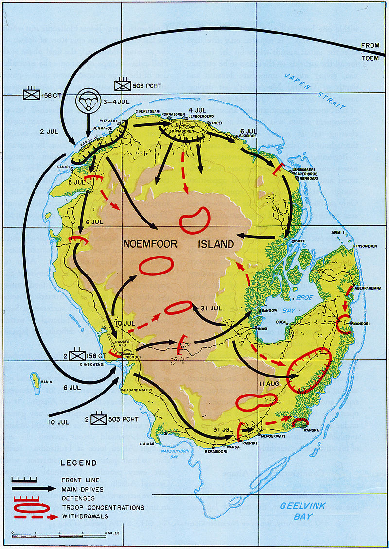 VASL Board below in USER FILES. . . .Douglas MacArthur coveted Noemfoor Island for the three airfields it possessed. D-Day was set for July 2, 1944 and the U.S. Army’s 158 RCT clambered ashore against little opposition. On July 3rd and 4th the 503rd Parachute Infantry Regiment’s 1st and 3rd Battalions were to airdropped into the beachhead centered on Kamiri airfield. Due to the size of the drop zone as well as the condition of the airfield, the two battalions suffered a 9% jump casualty rate. This was bad enough - but soon the 503rd would be called upon to clear the Japanese off the southern end of Noemfoor.Attacker: American (Company D, 503rd Parachute Infantry Regiment)