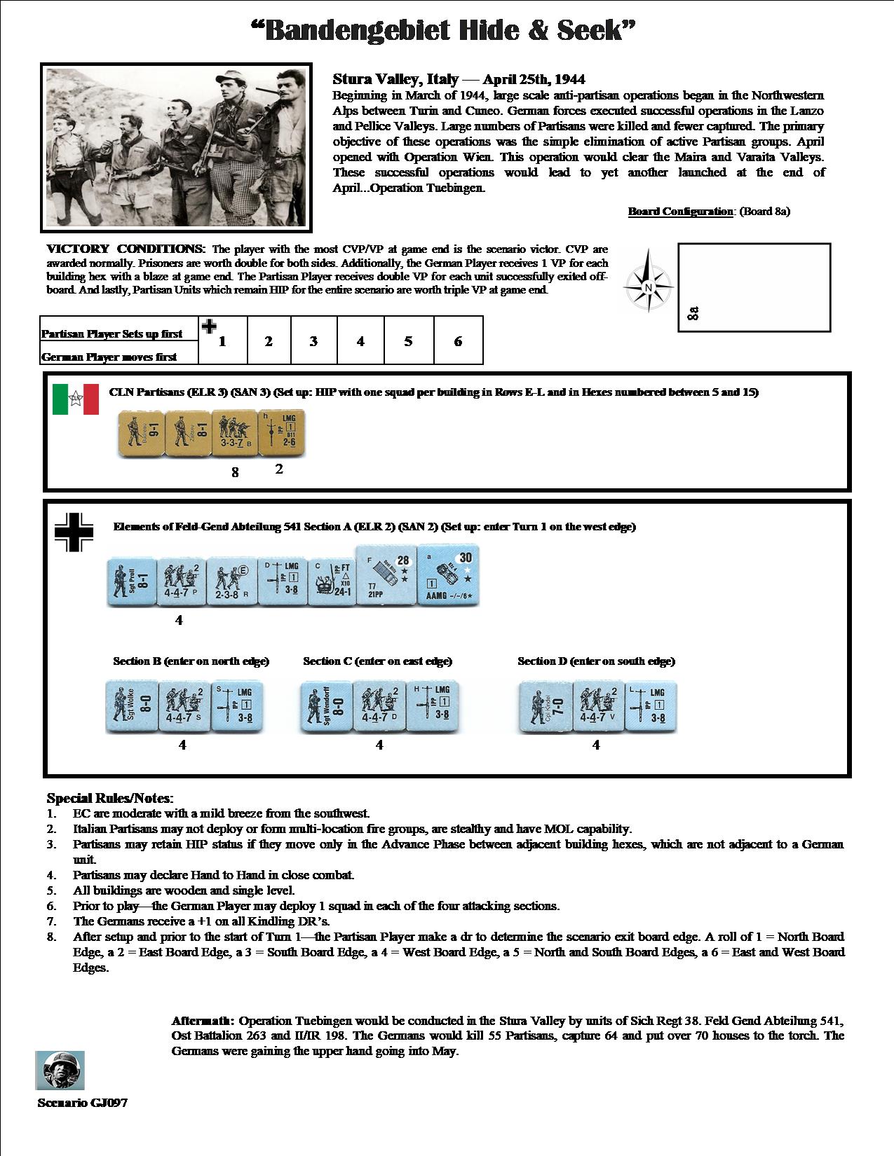 Beginning in March 1944, large-scale anti-Partisan operations began in the northwestern Alps between Turin and Cuneo. German forces executed successful operations in the Lanzo and Pellice valleys. Large numbers of Partisans were killed and even fewer were captured. The primary objective of these operations was the simple elimination of active Partisan groups. The month of April opened with “Operation Wien”. This operation would clear the Maira and Varaita valleys. These successful operations would lead to another launched at the end of April…”Operation Tuebingen”.Attacker: German (Feld-Gend Abteilung 541)