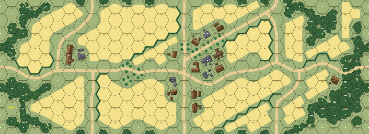 The Germans advanced methodically on both Russian flanks. On Turn 2, the German armor was surprised as they encountered both Russian ATRs. However, the Russians failed to gain hits or kills, despite 1 hex range shots. The Russians eventually gained one kill with an ATR, but both MMCs were broken, one CRed, and the Commissar was pinned leaving stuck behind in the RtPh. The Germans continued the advance, passing a poorly placed Russian AT gun. Once revealed, the AT gun often kept rate, but could not garner much effect beyond an eventual kill on another AFV until it was finally overwhelmed by the German attackers. The Russian BT, also poorly positioned, was shocked, and then recovered, only to be destroyed by two German AFVs which had maneuvered cutting off the Russian withdrawal path across the road into the village. The Russians were able to withdraw a few of their remaining Good Order squads across the road and positioned themselves to cover the open ground facing the Germans. The Russian KV set up to cover the side road and in LOS and CA of the Pz IIIH, but was nevery able to get a hit. Getting increasingly desperate, the Russian KV malfed the MA using IF and then suffered recall while trying to repair the MA. In the end, the Russians lost almost their entire force while the Germans suffered no infantry casualties. Using two AFVs, the Germans made a final push freezing a MMC with MMG in one building and another MMC in a second building which allowed the bulk of the German infantry to safely cross the road into the center of the village. With only one Good Order MMC remaining, the Russians conceded at the end of Turn 5.