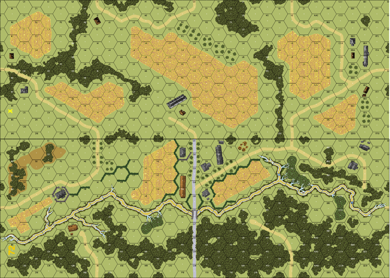 | Misc Rules: | LV Hindrance Mist Turns 1 and 2, Stream is Dry, multi-hex bldgs have RB Cellars |