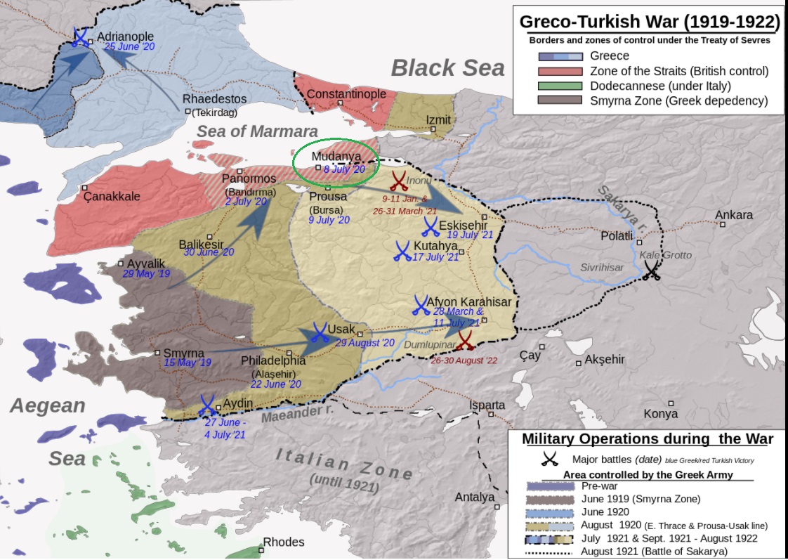 The United Kingdom occupied Constantinople, then fought against directly Turkish irregular forces in the Battle of Izmit with the Greek troops, however after this the United Kingdom would not take part in any more major fighting. Moreover the British troops occupied several towns in Turkey such as Mudanya. Naval landing forces had tried to capture Mudanya as early as 25 June 1920, but stubborn Turkish resistance inflicted casualties on British forces and forced them to withdraw. There were many instances of successful delaying operations of small Turkish irregular forces against numerical superior enemy troops,Attacker: Allies (British and Greek) (4th Infantry Division)