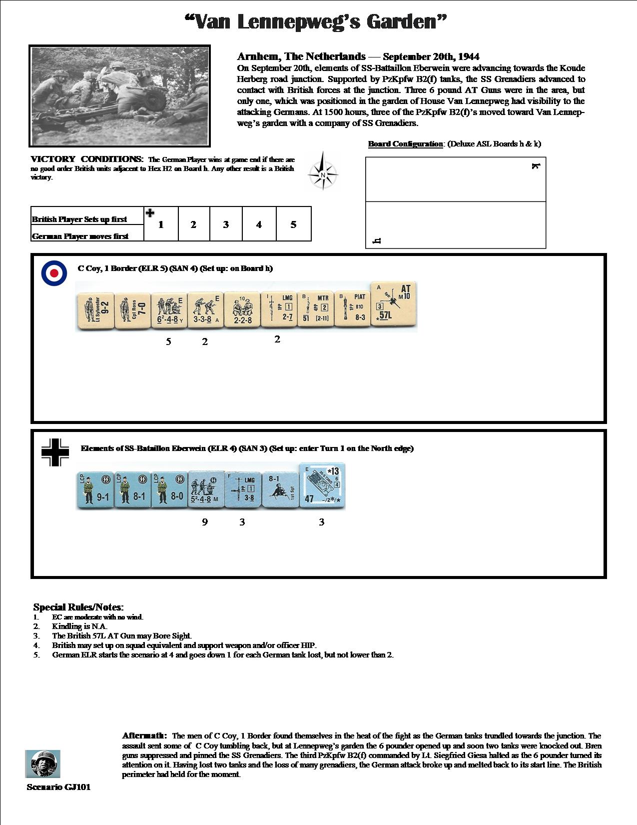 On September 20th, elements of SS-Battaillon Eberwein were advancing towards the Konde Herberg road junction. Supported by PzKpfw B2(f) tanks, the SS Grenadiers advanced to make contact with British forces at the junction. Three 6 pound AT Guns were in the area, but only one, which was positioned in the garden of House Van Lennepweg had visibility to the attacking Germans. At 1500 hours, three of the PzKpfw B2(f)’s moved toward Van Lennepweg’s Garden with a company of SS Grenadiers.Attacker: German (SS) (SS-Bataillon Eberwein)