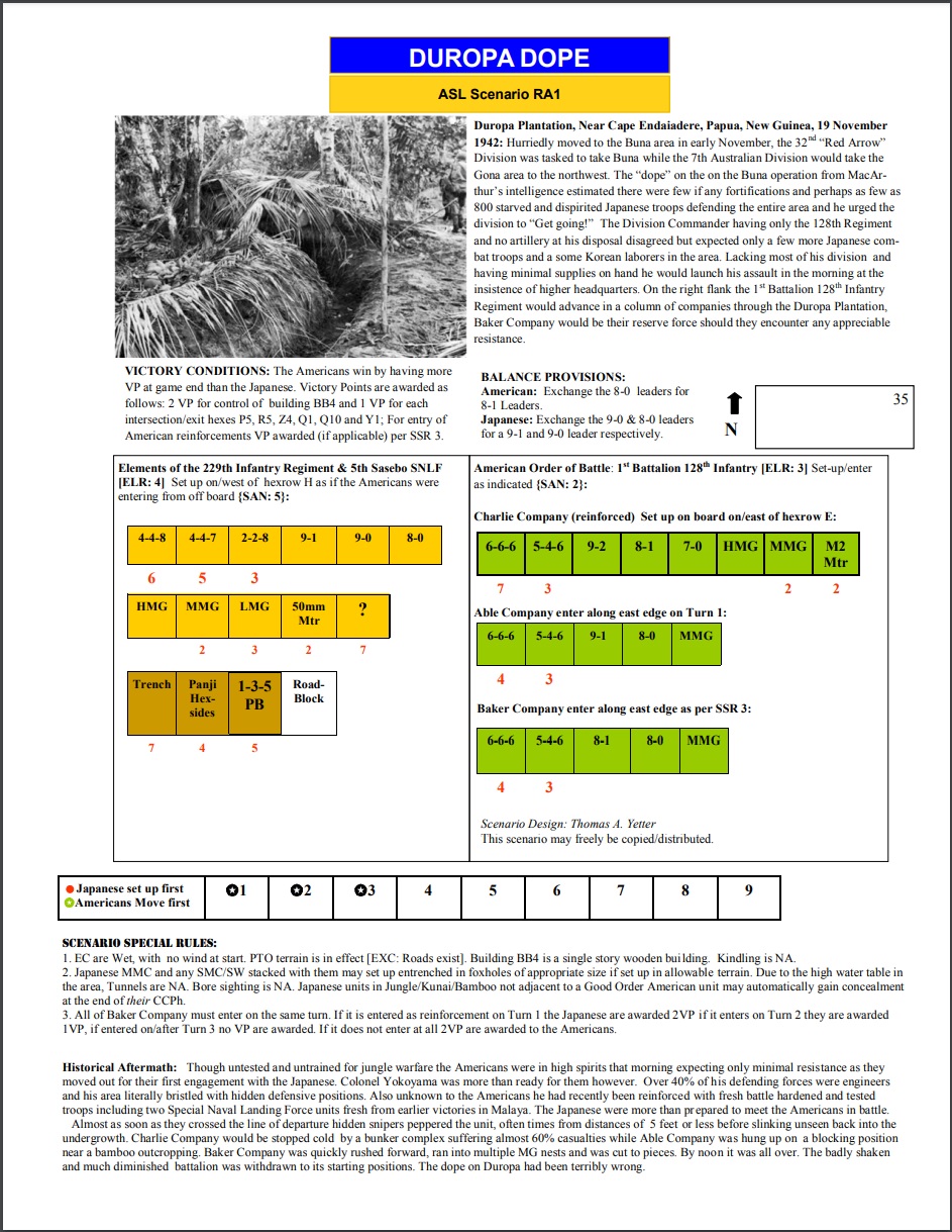 In November of 1942 the 32nd "Red Arrow" Infantry Division was hurriedly dispatched to the northern coast of Papua, New Guinea to assist the Australian 7th Infantry Division in the destruction of what MacArthur's intelligence service assumed to be a few starved and shattered remnants of their forces that had attempted to take Port Morseby. Possessing only a single regiment of his division, short on supplies and jungle experience while possessing but a single 105mm HOW with 6 rounds of ammunition as his divisional artillery, the Division Commander was prodded into an attack near Buna Station by MacArthur. This would be their first taste of battle and the Japanese were more than ready accommodate them....*Scenario card is also available under User Files in PDF*Attacker: American (1st Battalion, 128th Infantry Regiment, 32nd Infantry Division)