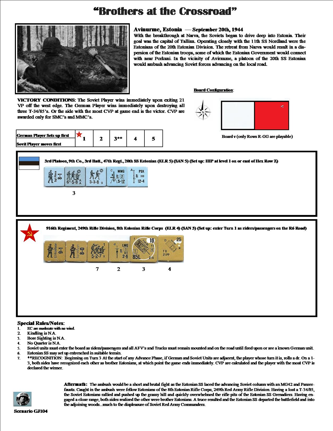 With the breakthrough at Narva, the Soviets began to drive deep into Estonia. Their goal was the capital of Tallinm. Operating closely with the 11th SS Nordland were the Estonians of the 20th Estonian Division. The retreat from Narva would result in a dispersion of the Estonian troops, some of which the Estonian Government would connect with near Porkumi. In the vicimity of Avirmume, a platoon of the 20th SS Estonian would ambush advancing Soviet forces advancing on the local road.Attacker: Russian (916th Regiment, 249th Rifle Division, 8th Estonian Rifle Corps)