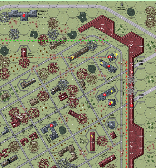 The entire area within the walls of Intramuros had been subjected to a massive artillery barrage the previous day and another artillery attack that lasted for ninety minutes on the morning of the main attack. When the last shells bad roared overhead~ the men of 3rd Battalion, 145th Infantry Regiment began moving through the breach in the east wall. They soon began receiving heavy machine gun and automatic weapons fire from the areas around Letran University and San Juan de Dios Hospital.Attacker: American (1st Battalion, 145th Infantry Regiment, 37th Infantry Division)