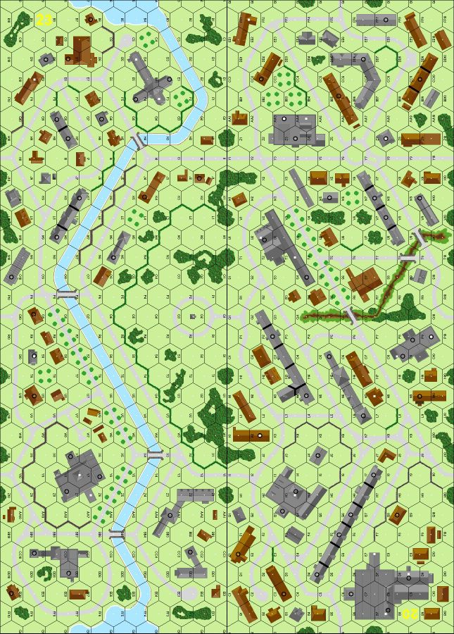 The fortunes of war had turned full circle. The Reichstag was in flames; the war all but over. Surviving elements of Panzer Division Muencheberg, the final stalwart defenders of Berlin, decided to attempt breakout to the west rather than surrender to the Russians. Believing that the Havel crossings at Spandau in western Berlin were only lightly defended, the few remaining units moved out from Tiergarten after dark on May 2nd.. . . [Mark Nixon, Journal #1]: High quality Russians hold the canal bridges against rag-tag remnants of the Muencheberg Panzer Division, fleeing Berlin in the last days of the war. Scenario parameters force the Germans into a frenzied rush across those bridges and something of those fearful days seems captured here in cardboard.Attacker: German (Muencheberg Panzer Division)