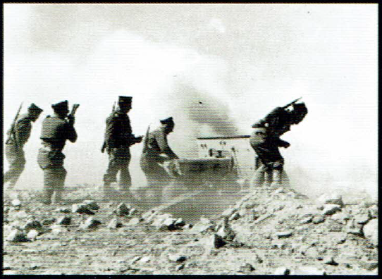 "Go for them, like in Madrid!" -- Bir Hakeim was an oasis in the middle of the Libyan desert about 60 km from the coast where there was a ruined Ottoman fort. The position was at a crossroads and had an approximate shape of an equilateral triangle with sides of more than 5 km and the point of support on some summits whose highest point, Hill 186, was to the NE of the position - actually it was about two small embankments of accumulated sand on the ruins of two old water tanks nicknamed "the boobs" (les mamelles). The fort was located on the southern edge of the device. There were trenches and emplacements buried and consolidated with sandbags, in addition to some 50,000 scattered mines, leaving corridors for the patrols. A portion of the position had barbed wire. At 09:00 hours, a wave of 50 tanks and a second wave of 30 from the 132 Division Ariete under the command of General De Stefanis launched the attack on the position. De Stefanis, very irritated, radioed the following message to the section leaders: "Don’t stop, go ahead, go ahead!"Attacker: Italian (Elements of the 132nd Tank Regiment, Ariete Division)