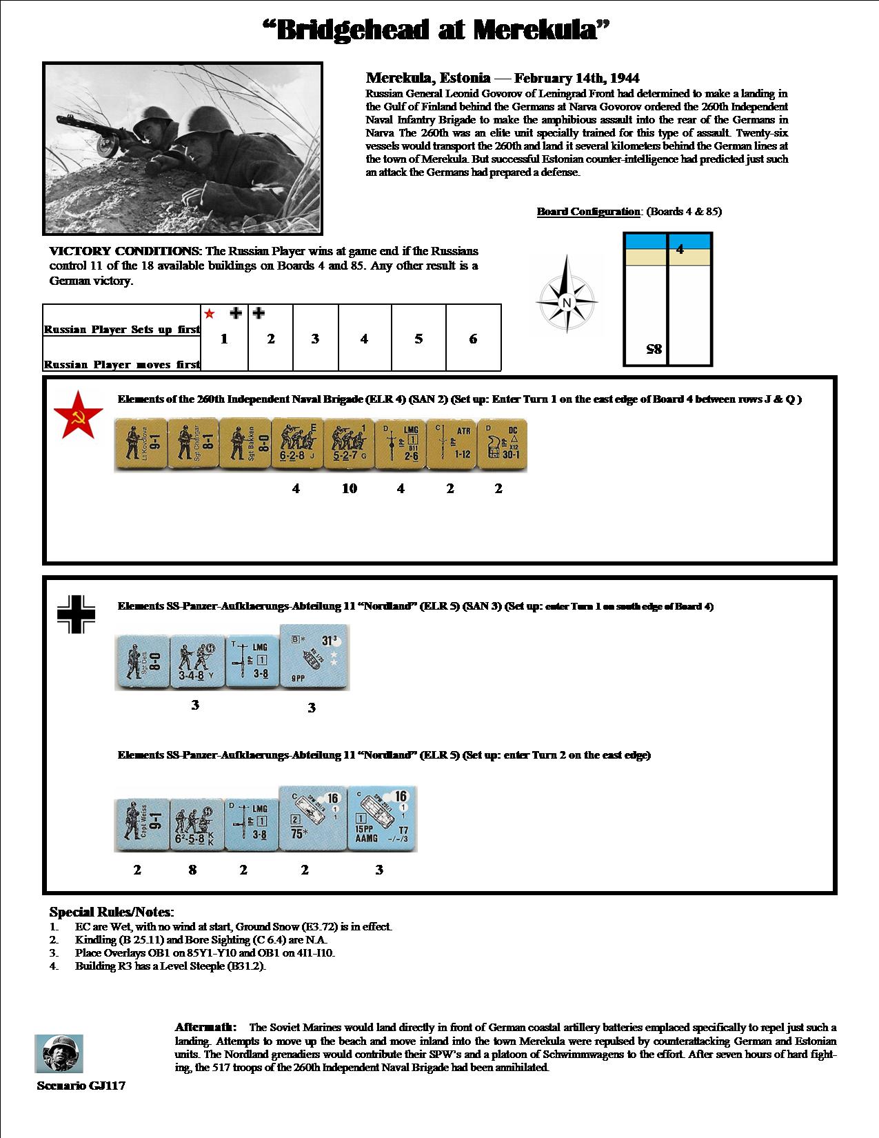 Russian General Leonid Govorov of the Leningrad Front had determined to make a landing in the Gulf of Finland behind the Germans at Narva. Govorov ordered the 260th Independent Naval Infantry Brigade to make the assault into the rear of the Germans. The 260th was an elite unit specially trained for this type of assault. Twenty-six vessels would transport the 260th and land it several kilometers behind the German lines at the town of Merekula. But successful Estonian counterintelligence had predicted just such an attack, and the German had prepared a defense.Attacker: Russian (260th Independent Naval Brigade)
