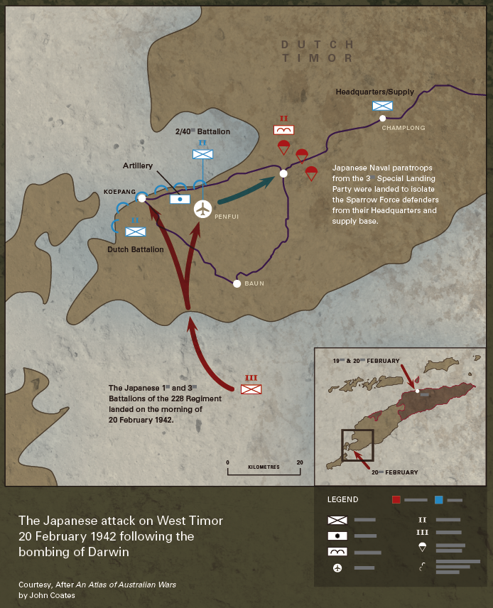 The island of Timor was crucial to Japanese southern expansion plans. In the western half of Timor, the main Allied defenses around the town of Koepang and Penfui airfield consisted primarily of Australian troops of Sparrow force. Japanese Naval paratroopers landed behind Australian lines in an attempt to seize the airfield. They were met by rear echelon units from the 2/40th Battalion at the village of Babau. A fierce fight erupted at the Timorese village and fortunes for both sides ebbed and flowed over the day. Despite the Australians controlling Babau at day's end, they pulled back to a neighboring village for the night. However, the Aussies had stopped the Japanese from achieving their goal of seizing the airfield.Attacker: Japanese (1 Company, Yokosuka 3rd Special Naval Landing Force, Eastern Detachment)