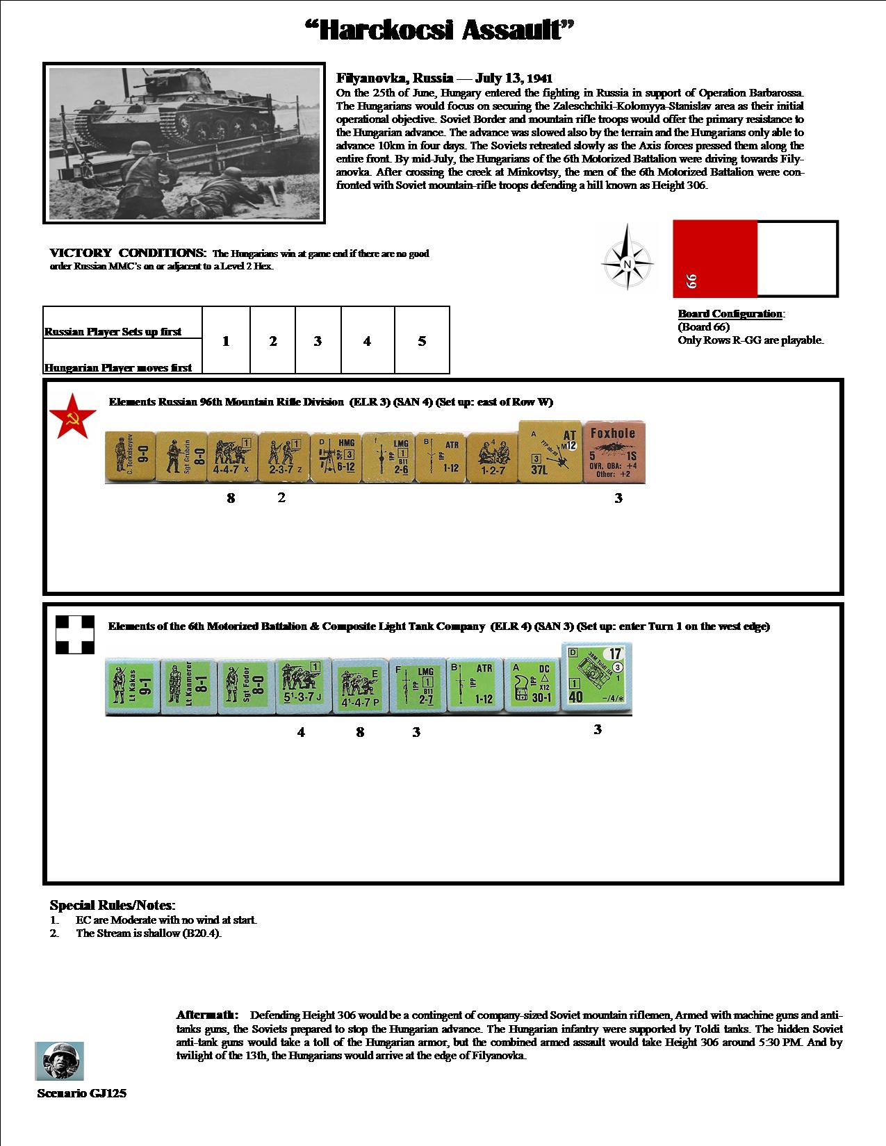 On the 25th of June, Hungary entered the fighting in Russia in support of Operation Barbarossa. The Hungarians would focus on securing the Zaleschchiki-Stanislav area as their initial operational objective. Soviet Border and Mountain Rifle troops would offer primary resistance to the Hungarian advance. The advance was slowed also by the terrain and the Hungarians only able to advance 10km in four days. The Soviets retreated slowly as the Axis forces pressed them along the entire front. By mid-July. the Hungarians of the 6th Motorized Battalion were driving towards Filyanovka. After crossing the creek at Minkovtsy, the men of the 60th Motorized Battalion were confronted with Soviet Mountain-rifle troops defending a hill known as Height 306.Attacker: Hungarian (6th Motorized Battalion and Composite Light Tank Company)