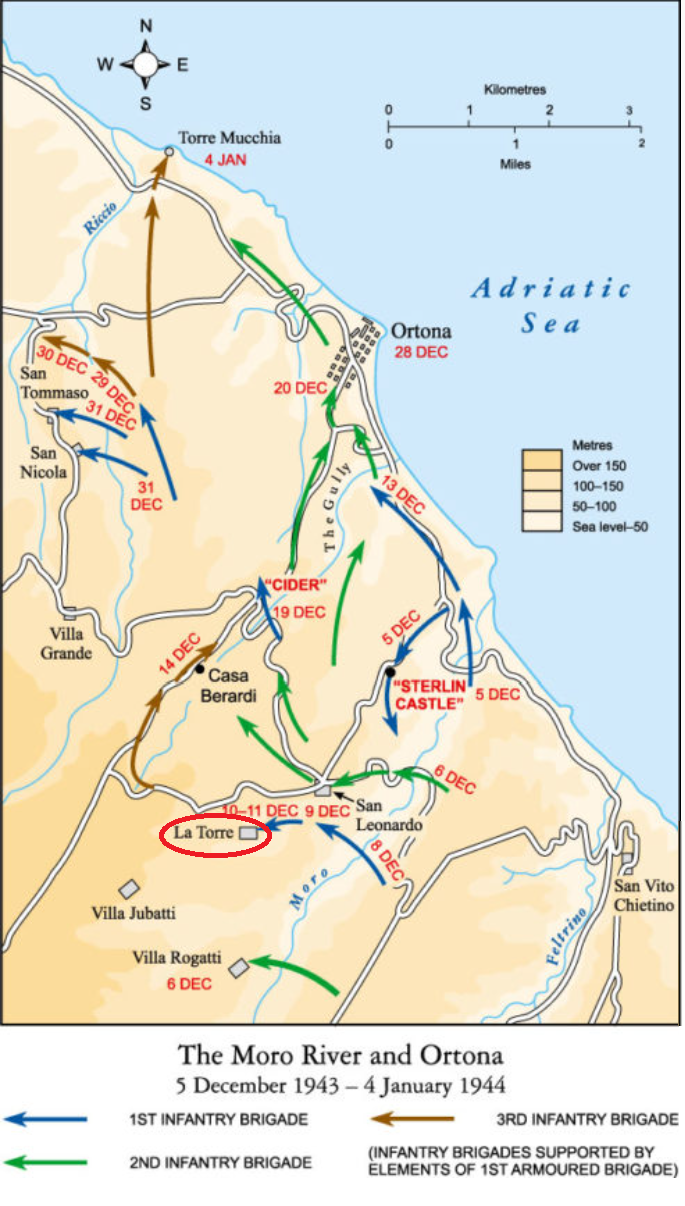 On the evening of 7 December General Vokes issued his orders for another crossing of the Moro, having planned it as an operation by two brigades to secure the main axis and its junction with the Orsogna-Ortona lateral. The plan called for an initial two-pronged assault by the 1st Brigade to capture San Leonardo, and a subsequent breakout by the 2nd Brigade to seize the divisional objective. From the Hastings and Prince Edward bridgehead on the right the Royal Canadian regiment (RCR). would thrust south-westward along the plateau against San Leonardo, while at the same time the 48th Highlanders would make a frontal attack across the river on to the spur of ground between San Leonardo and La Torre. Once the 1st Brigade had secured a firm base on the San Leonardo escarpment, a strong infantry and armoured force would cross the Moro and strike at the junction on the Ortona road. On the La Torre spur to the west of San Leonardo the frontal assault of the 48th Highlanders had been more successful, for both infantry and artillery had benefited from several days of observing enemy positions from the Sant' Apollinare side of the river. After the preliminary bombardment, Lieutenant-Colonel Johnston sent two companies across. The enemy's artillery caught one in the river bottom, but there was no other resistance. By 2000 hours that evening all companies had crossed and were dug in against counter-attack.Attacker: Canadian (48th Highlanders of Canada Regiment)