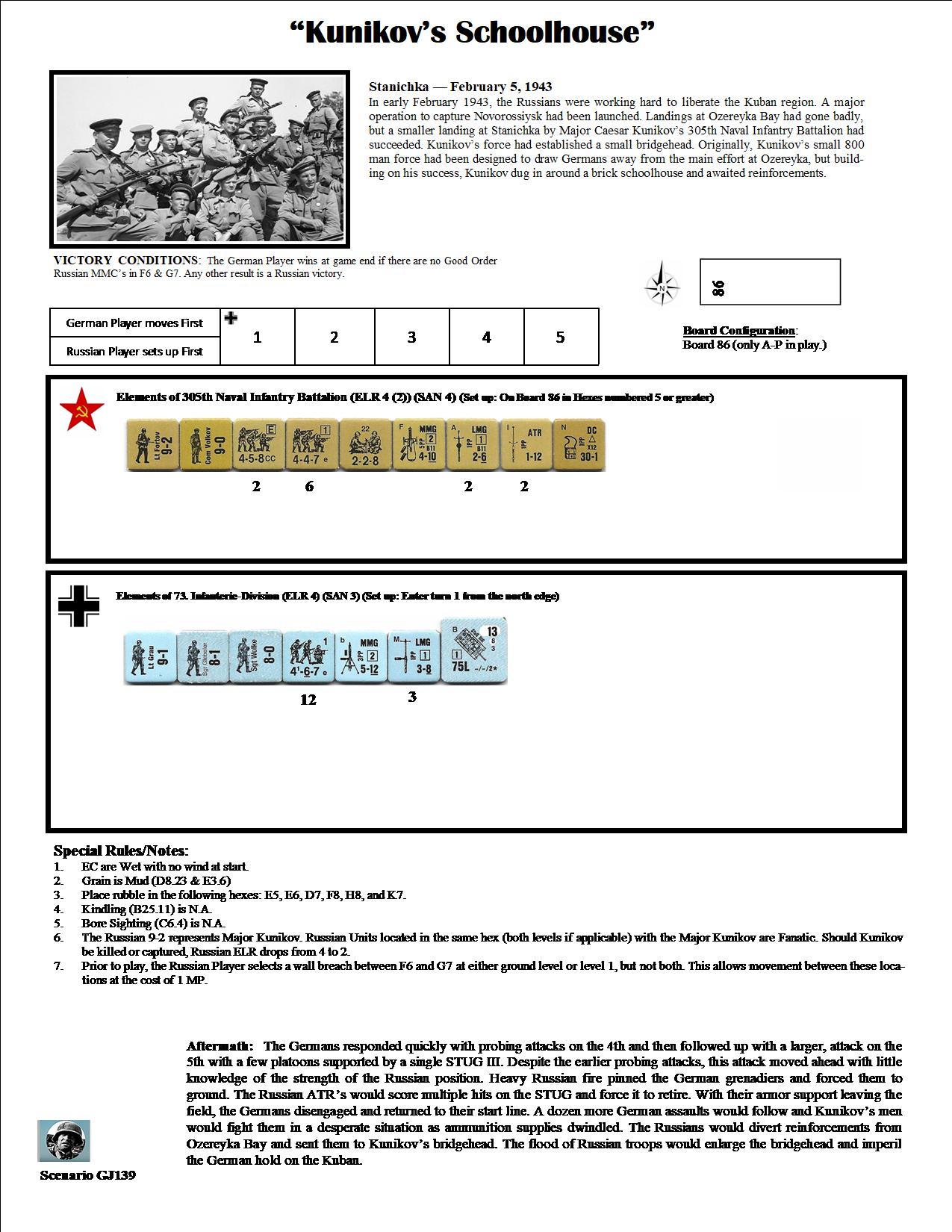 In early February 1943, the Russians were working hard to liberate the Kuban region. A major operation to capture Novorossiysk had been launched. Landings at Ozereyka Bay had gone badly, but a smaller landing at Stanichka by Major Caesar Kunikov’s 305th Naval Infantry Battalion had succeeded. Kunikov’s force had established a small bridgehead. Originally, Kunikov’s small 800 man force had been designed to draw Germans away from the main effort at Ozereyka, but building on his success, Kunikov dug in around a brick schoolhouse and awaited reinforcements.Attacker: German (73. Infanterie-Division)